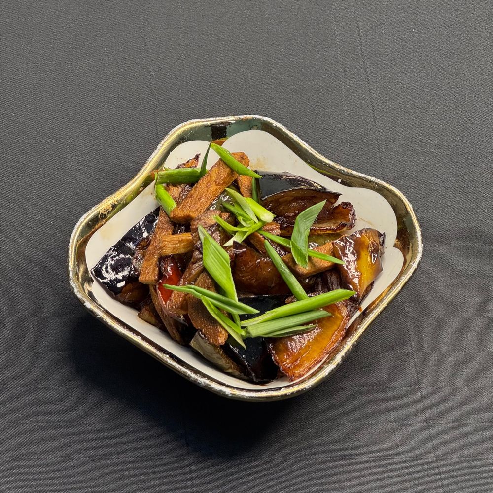 Баклажаны жареные, говядина, перец, свежие огурцы, зелёный лук, соевый соус зелень 160г